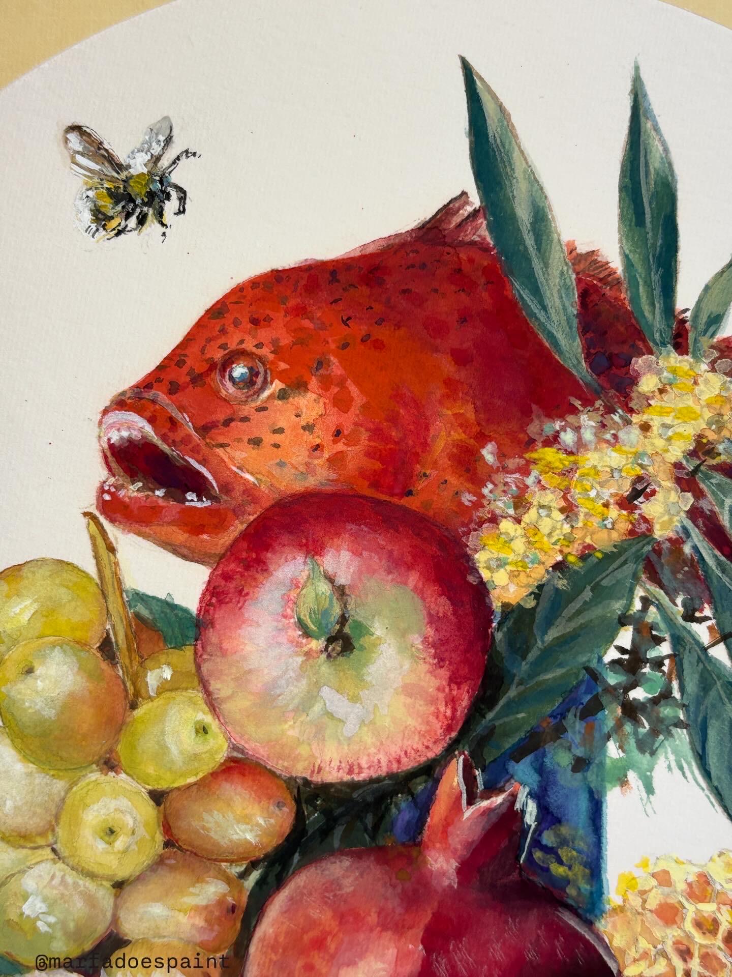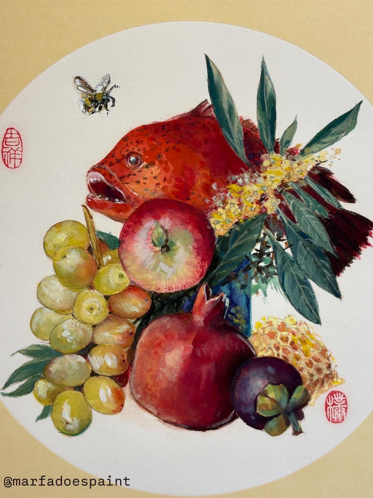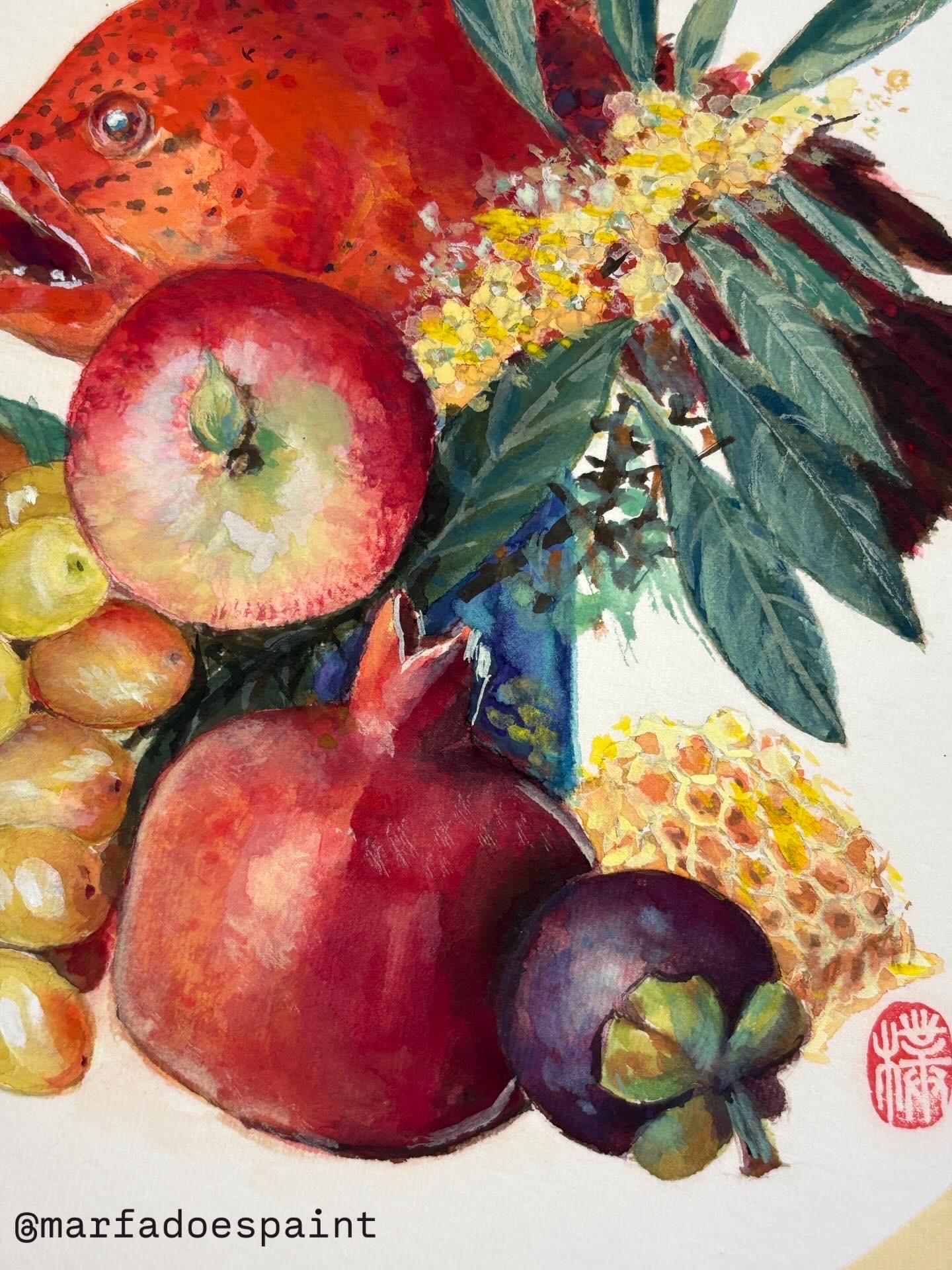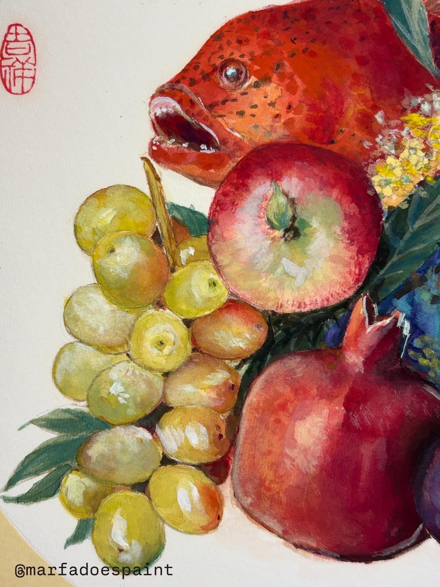 A festive still life on cooked rice paper. 33x33 cm.Different delivery options are available. Please contact me for details.